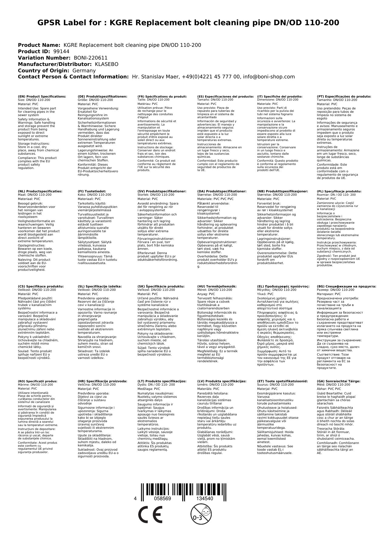 | Produktart | Ersatzbolzen für Reinigungsrohr |
