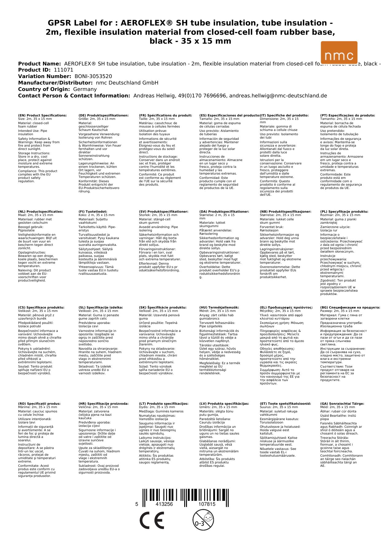 AEROFLEX® SH Rohrisolierung, Rohrdämmung - 2m, Flexibler Dämmstoff aus Geschlossenzelligem Schaum Kautschukbasis, Schwarz - 35 x 15 mm