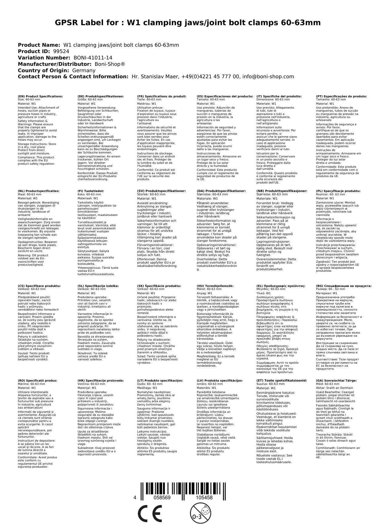 - W2: Band, Gehäuse aus Edelstahl oder gleichwertigem korrosionsbeständigem Stahl gemäß DIN 3017, Schraube Stahl verzinkt