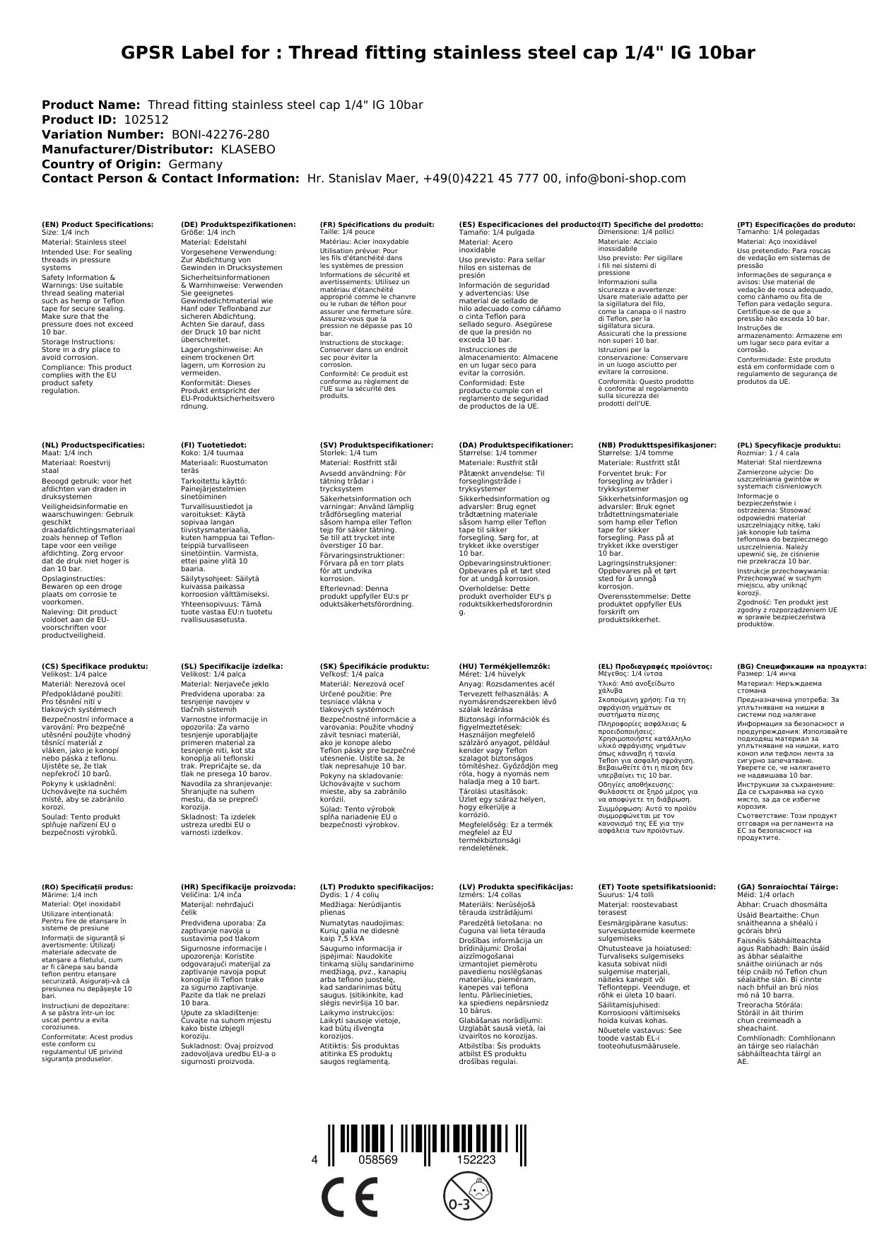 Edelstahl Kappe, Gewindefitting Edelstahl, 1/4 Zoll IG, 10 bar