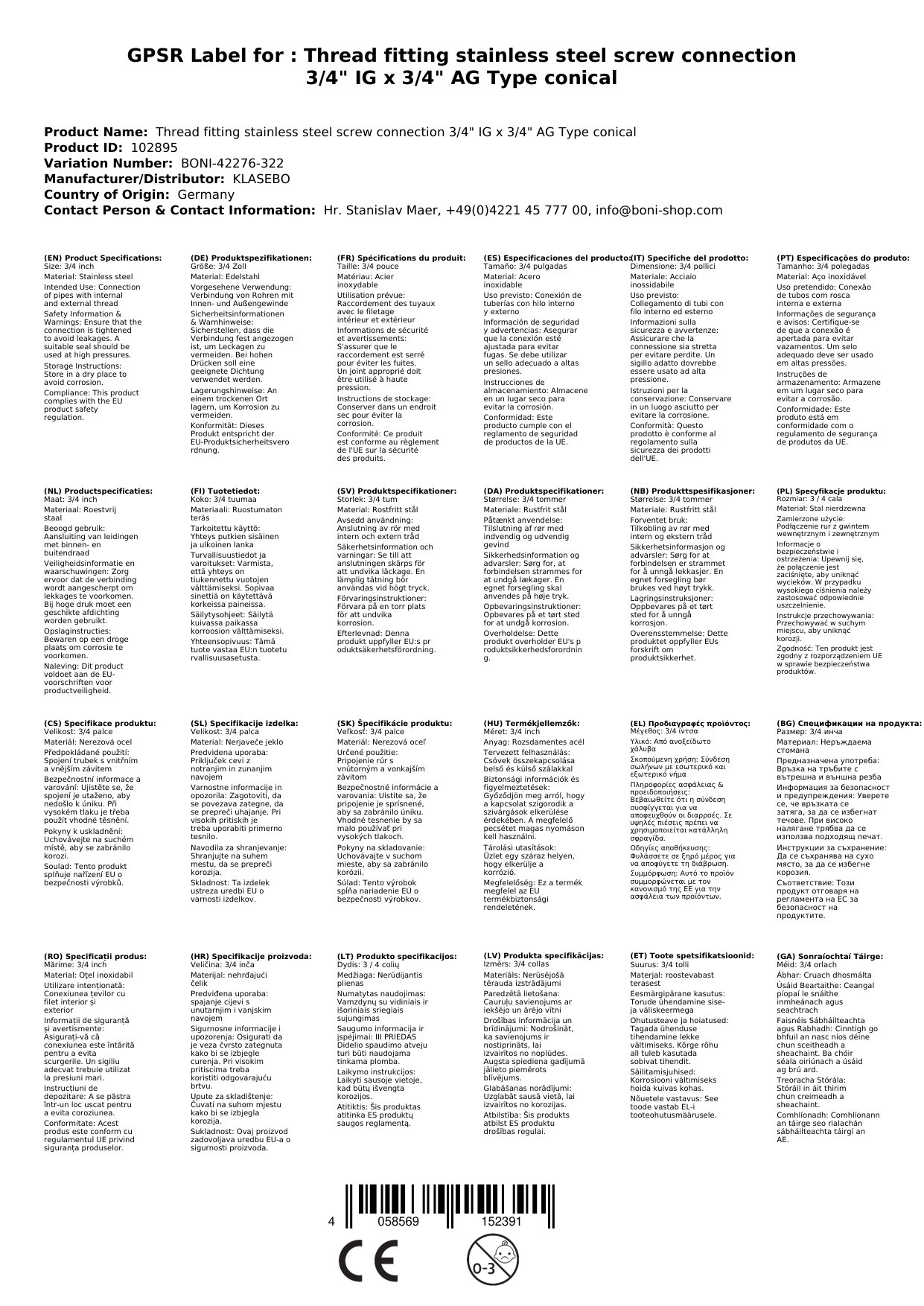 Stellen Sie eine Frage, um mehr über das Produkt zu erfahrenGewindefitting Edelstahl Verschraubung 3/4" IG x 3/4" AG Typ konisch