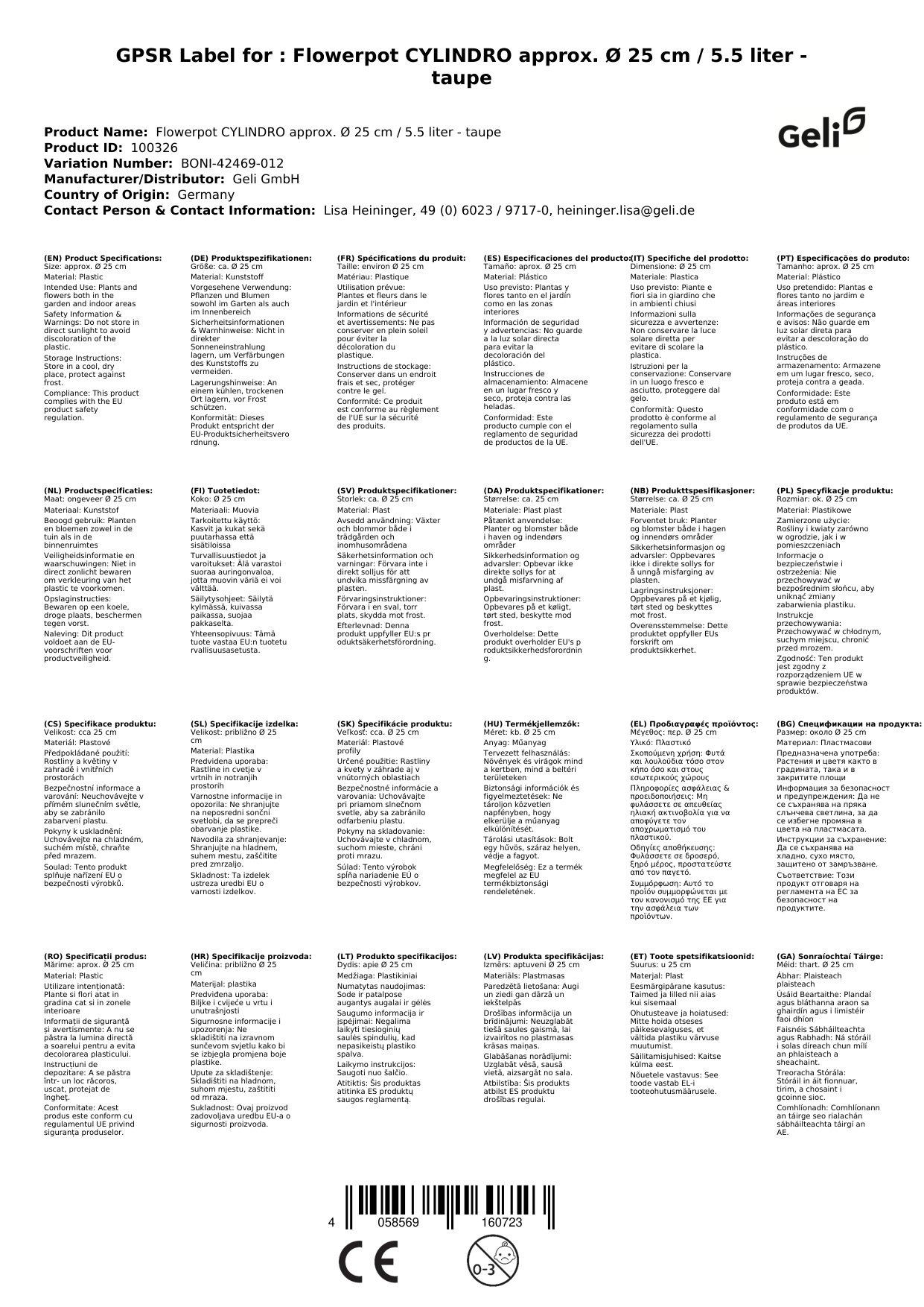 Blumentopf CYLINDRO, 25 cm, 5,5 Liter, taupe