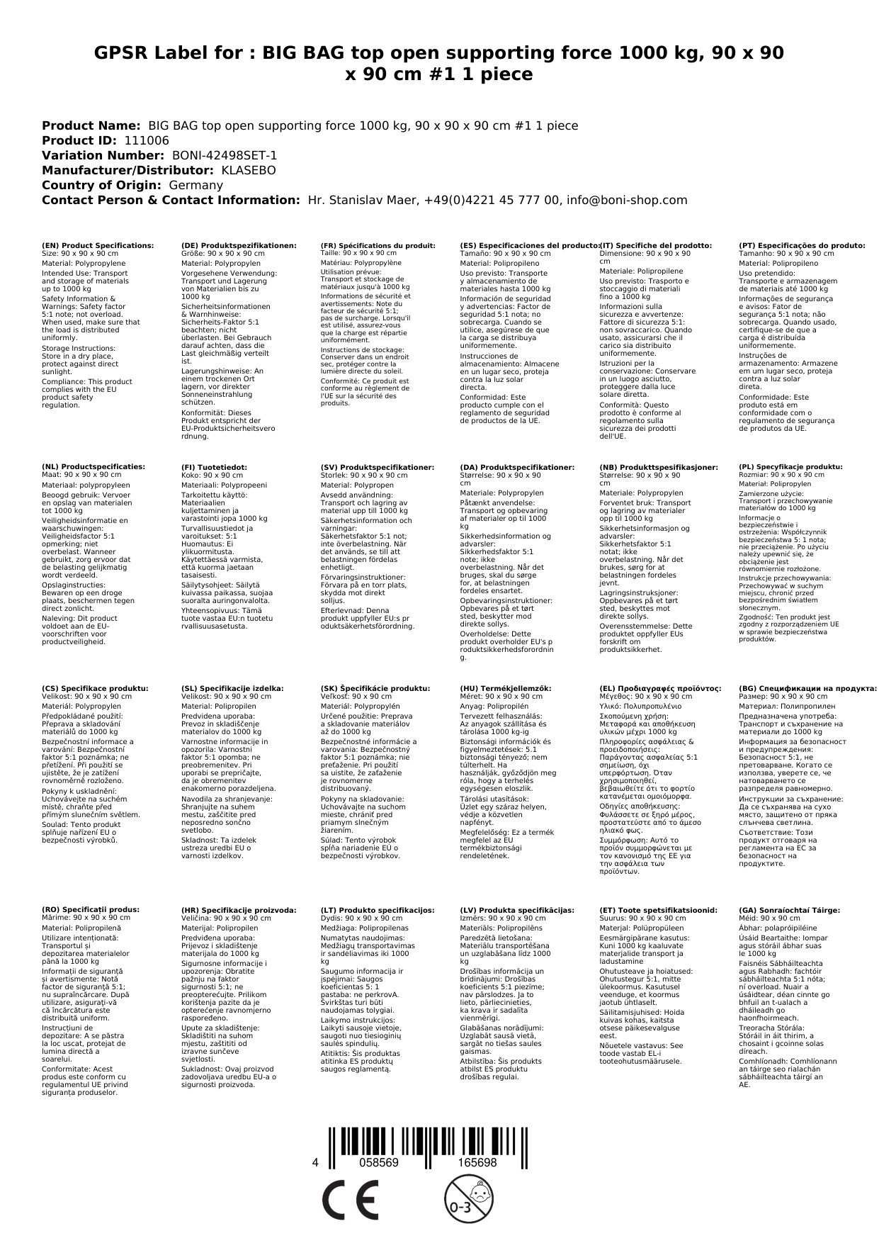 Lagern Sie den Big Bag an einem trockenen und sauberen Ort, geschützt vor direkter Sonneneinstrahlung. Vermeiden Sie den Kontakt mit spitzen oder scharfen Gegenständen.