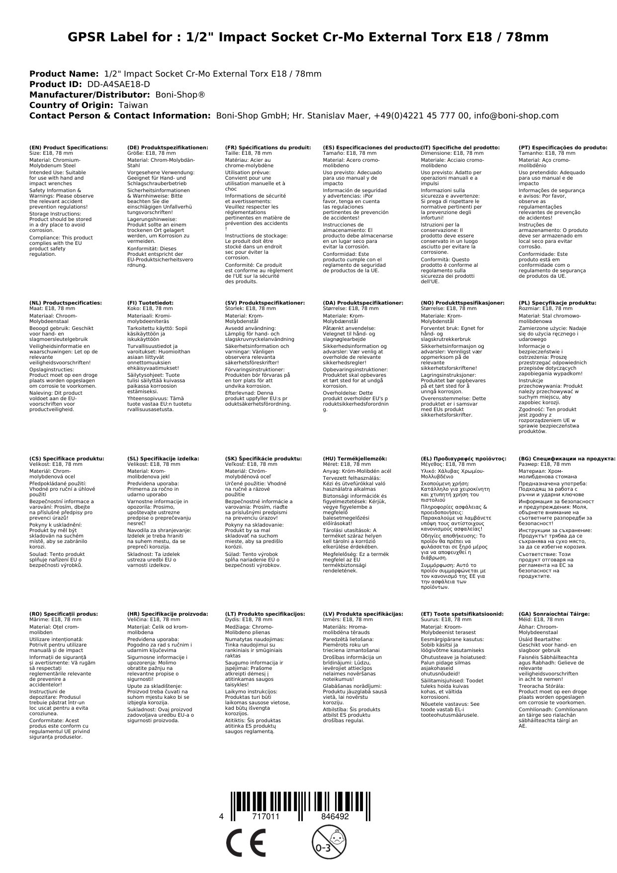 Die Schlagschrauber Nuss Innensechskant E18 ist aus robustem Chrom-Molybdän-Stahl gefertigt, was eine hohe Festigkeit und lange Lebensdauer garantiert. Die Größe E18 und die 1/2 Zoll Aufnahme sorgen für Kompatibilität mit gängigen Schlagschraubern. Dank der Länge von ca. 78 mm erreichst du auch schwer zugängliche Schrauben. Warum das für dich wichtig ist: Du erhältst ein Werkzeug, auf das du dich verlassen kannst und das dir lange Freude bereitet.