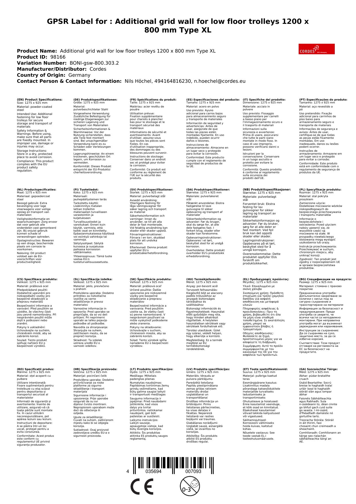 Die Gitterwand ist speziell für niedrige Etagenwagen mit den Maßen 1200 x 800 mm konzipiert. Bitte überprüfen Sie die Maße Ihres Wagens, um sicherzustellen, dass die Gitterwand passt.