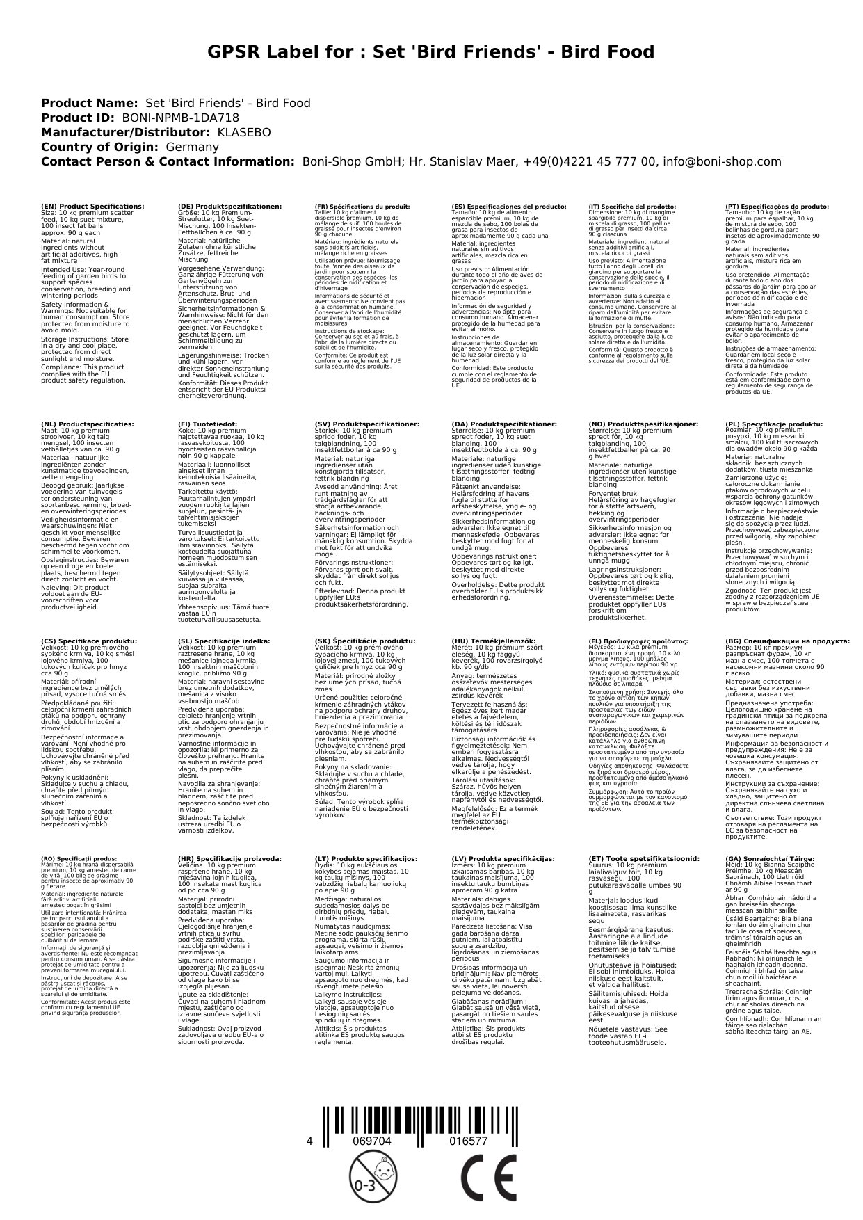 Stellen Sie eine Frage, um mehr über das Produkt zu erfahrenVogelfutter Set Ganzjahres 30kg - Premium Wildvogelfutter mit Streufutter 10kg, 100 Insektenfettbällchen ohne Netz und Hochenergetischem Suetfutter 10kg