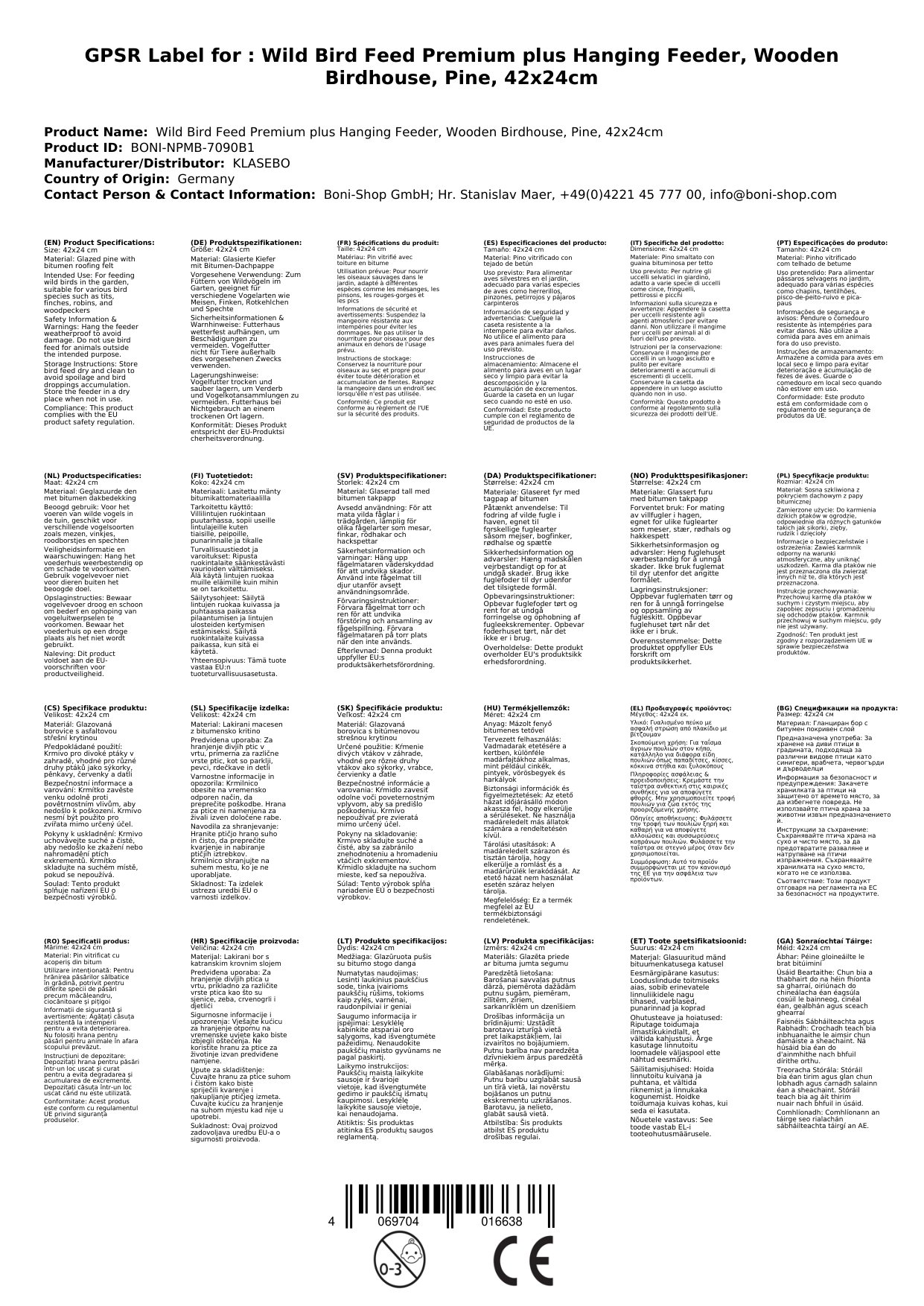 - Futterhaus: Hänge-Futterhaus aus glasierter Kiefer, wetterfest durch Bitumen-Dachpappe, Maße 42 x 24 cm.