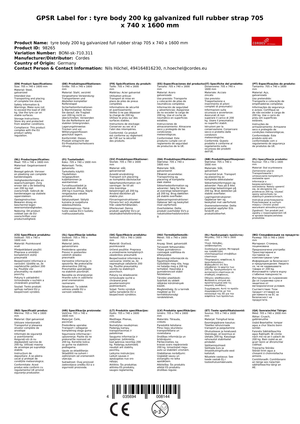 - Abmessungen: Die Reifenkarre hat die Maße 705 x 740 x 1600 mm (B x T x H).