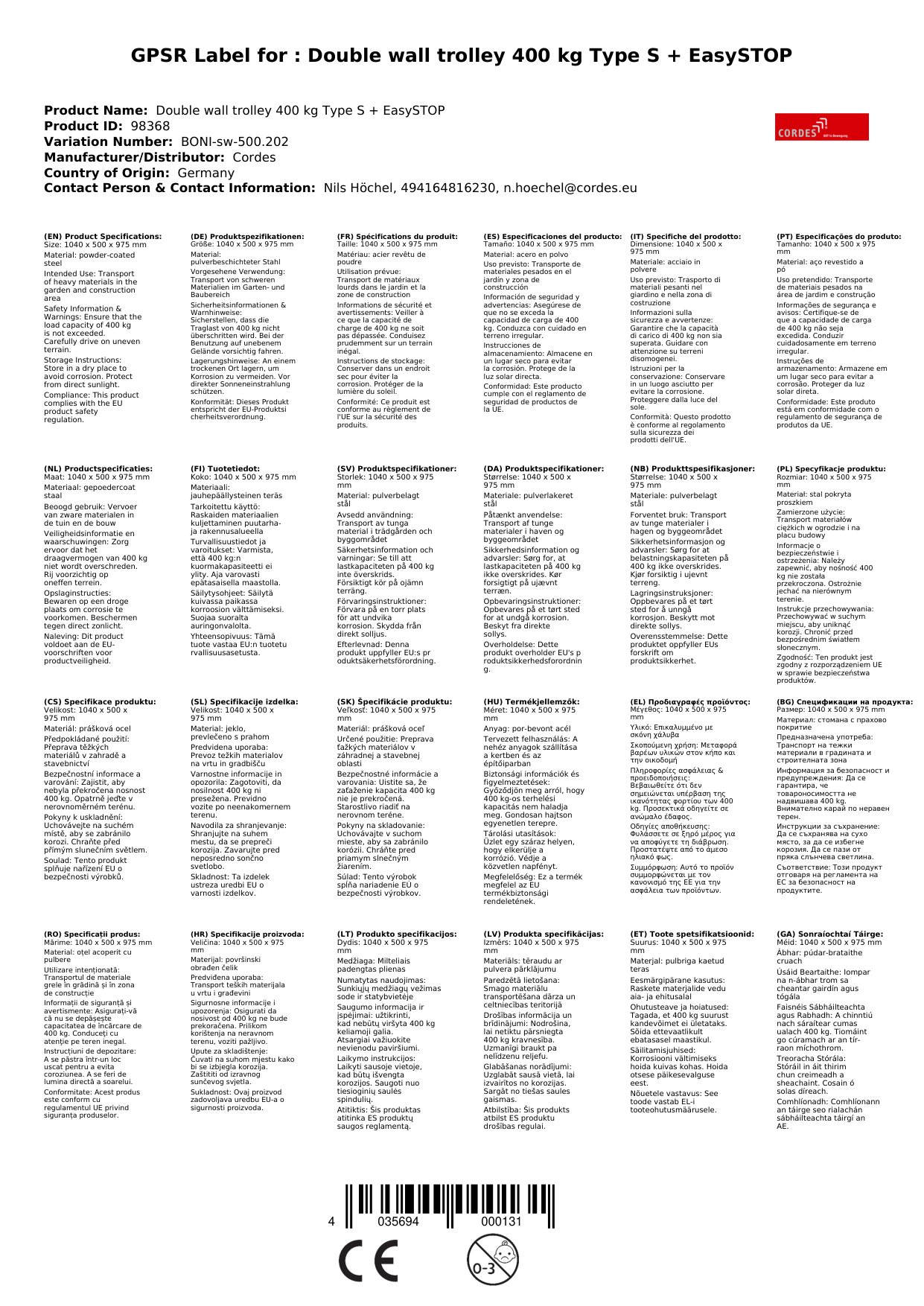 Der Doppel-Stirnwandwagen bietet Ihnen eine robuste Lösung für den Transport von Lasten bis zu 400 kg. Die pulverbeschichtete Oberfläche schützt vor Beschädigungen, während die Gummibereifung einen leisen und schonenden Transport gewährleistet. Dank der EasySTOP-Funktion können Sie den Wagen jederzeit sicher abstellen. Warum das für Sie wichtig ist: Sie erhalten einen zuverlässigen und langlebigen Transportwagen für den täglichen Einsatz.